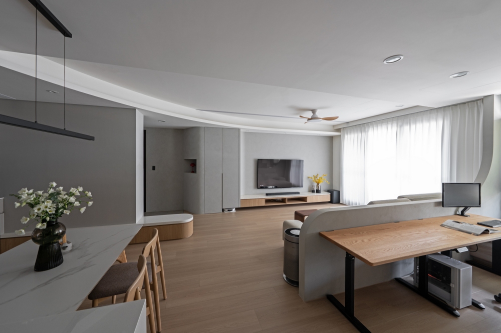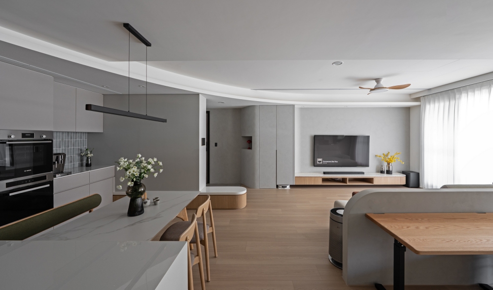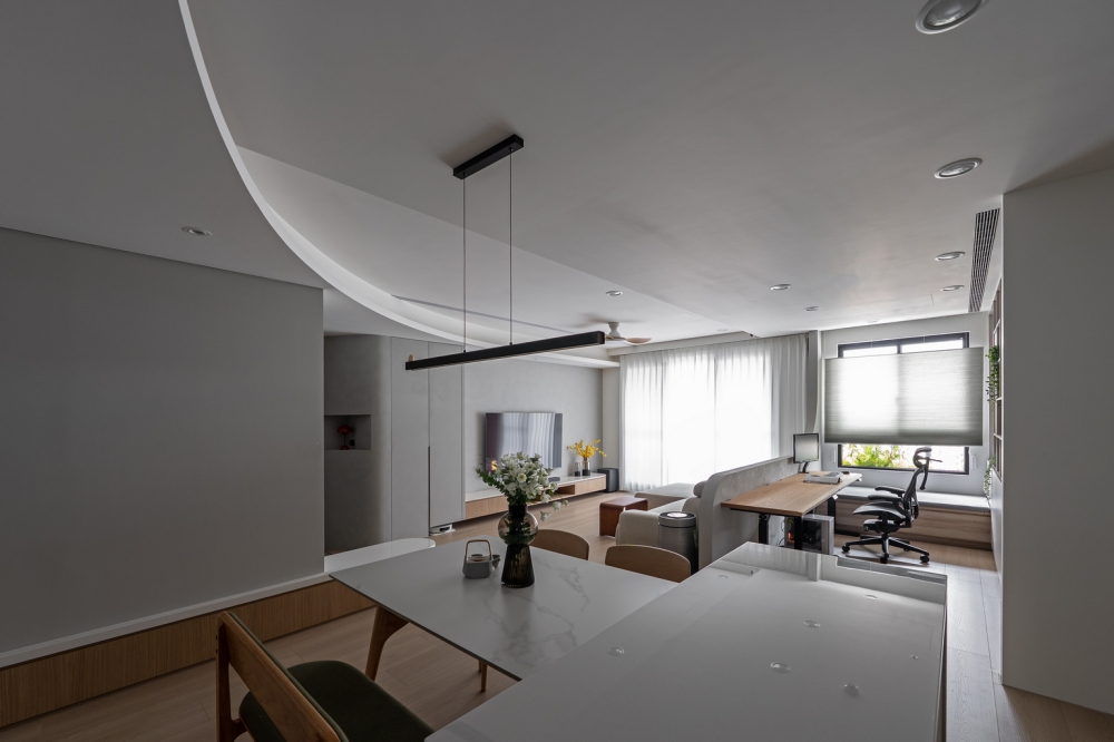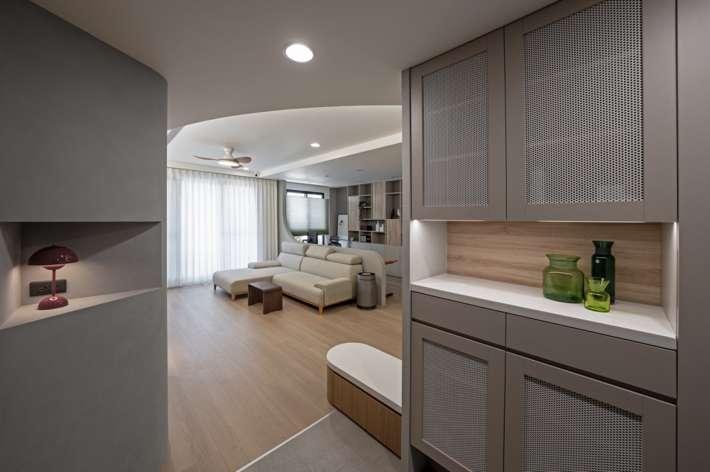 整體空間以柔和的灰、米、木質調為主軸,透過大面積礦物塗料牆與淺色木地板,營造靜謐的背景基調。局部以穿孔鐵板、霧面烤漆與石紋檯面增加材質層次,讓不同質地之間形成細膩對話。天花採用弧形轉折與間接照明的方式,柔化界線感,使空間動線自然過渡,亦呼應整體「柔光曲面」的設計語彙。