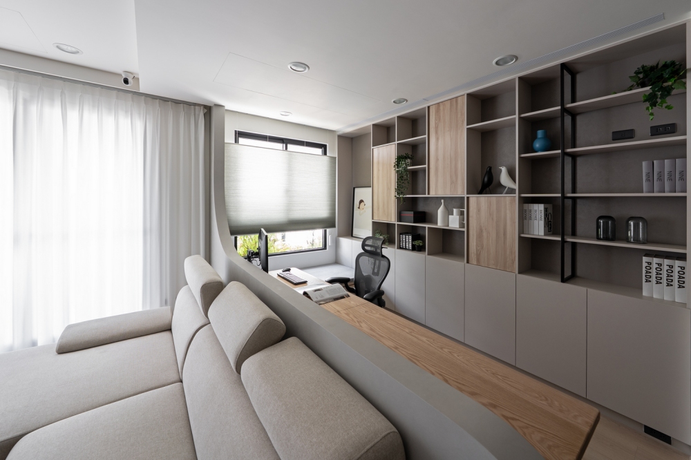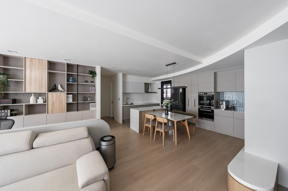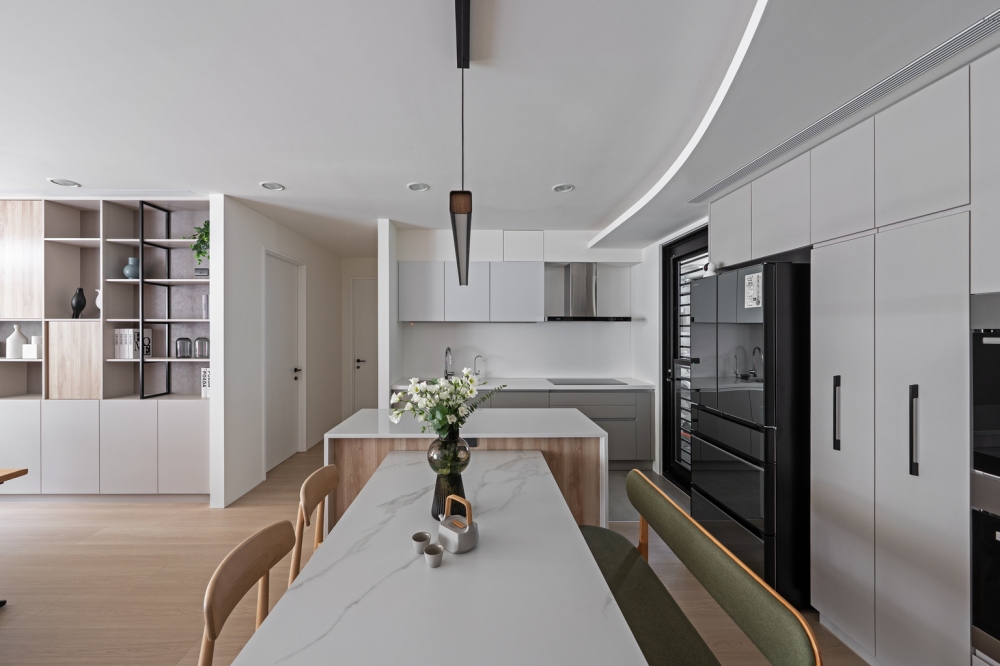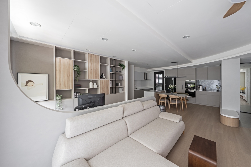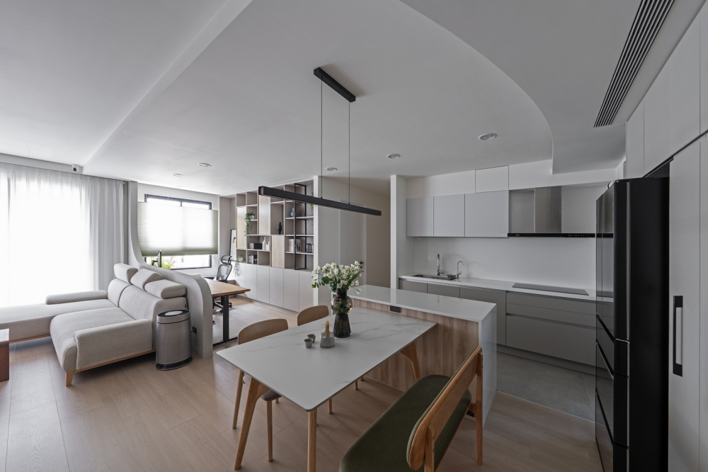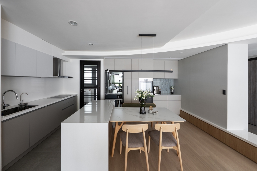 廚房經重新規劃為開放式配置,搭配中島與吧檯的延伸設計,成為料理、用餐與交流的核心。中島餐桌以淺灰石紋檯面結合木腳結構,呼應客廳沙發與木質電視櫃的溫潤質感,讓餐廚區與客廳自然融合。沙發背後延伸的半高隔牆形成書房區的界定,同時兼具視覺延伸與收納機能,使工作與休憩得以共存。