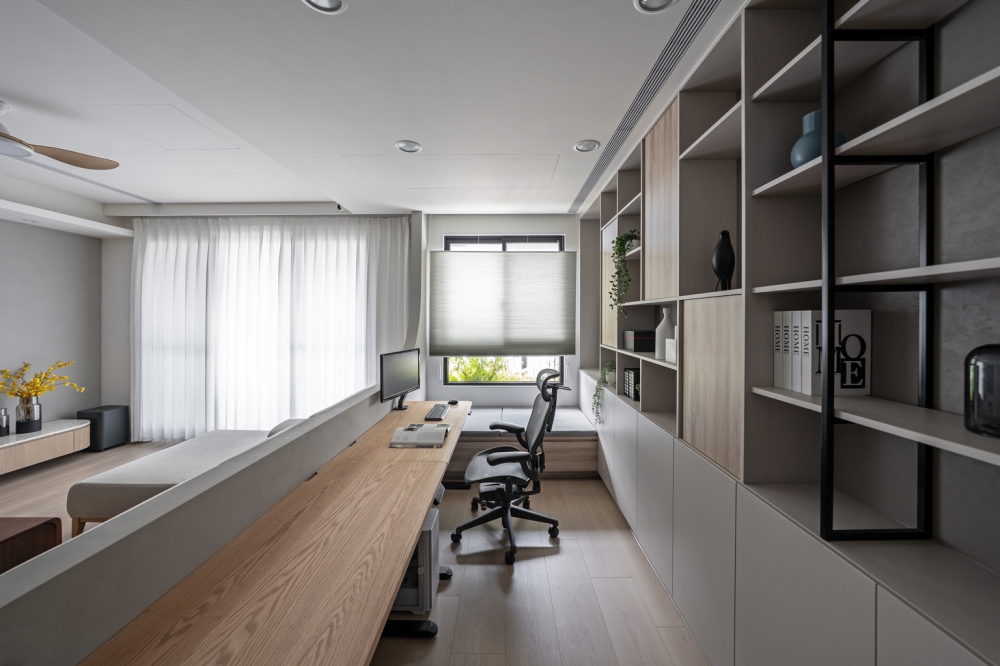 本案為姊妹二人共同居住的住宅空間,設計重點著重於「共享與獨立的平衡」。考量居住者的生活型態與交流需求,原本三房格局經客變後,將其中一房改為開放式書房,使書桌、展示櫃與客廳形成流動的視覺軸線,也讓陽光從窗邊延伸至整個公共區域,創造通透與互動並存的居家氛圍。