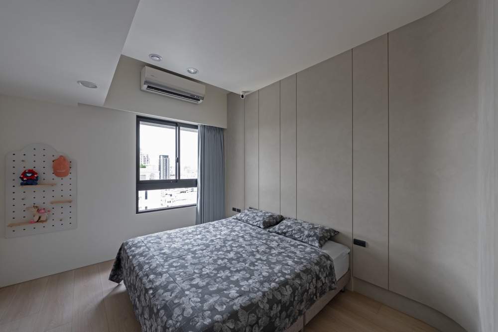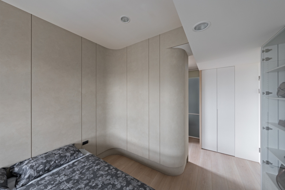 主臥室延續公區的灰米語彙,以垂直分割的礦物塗料牆面與弧角轉折作為收尾,呈現安定而柔和的氛圍。整體光線配置以自然光為主,輔以隱藏燈帶營造層次感,使空間在不同時間段呈現溫潤的光影變化。