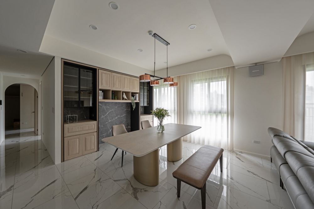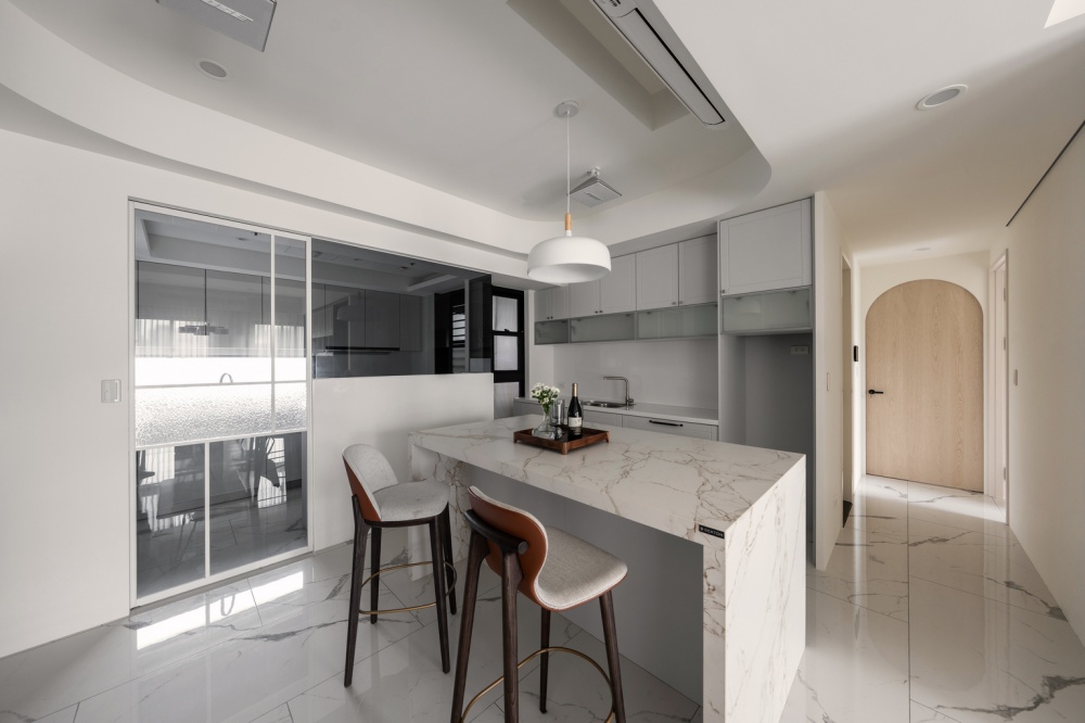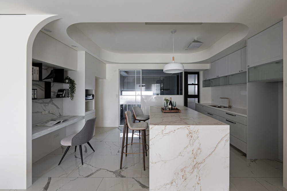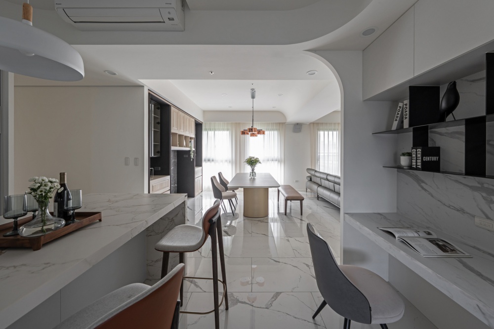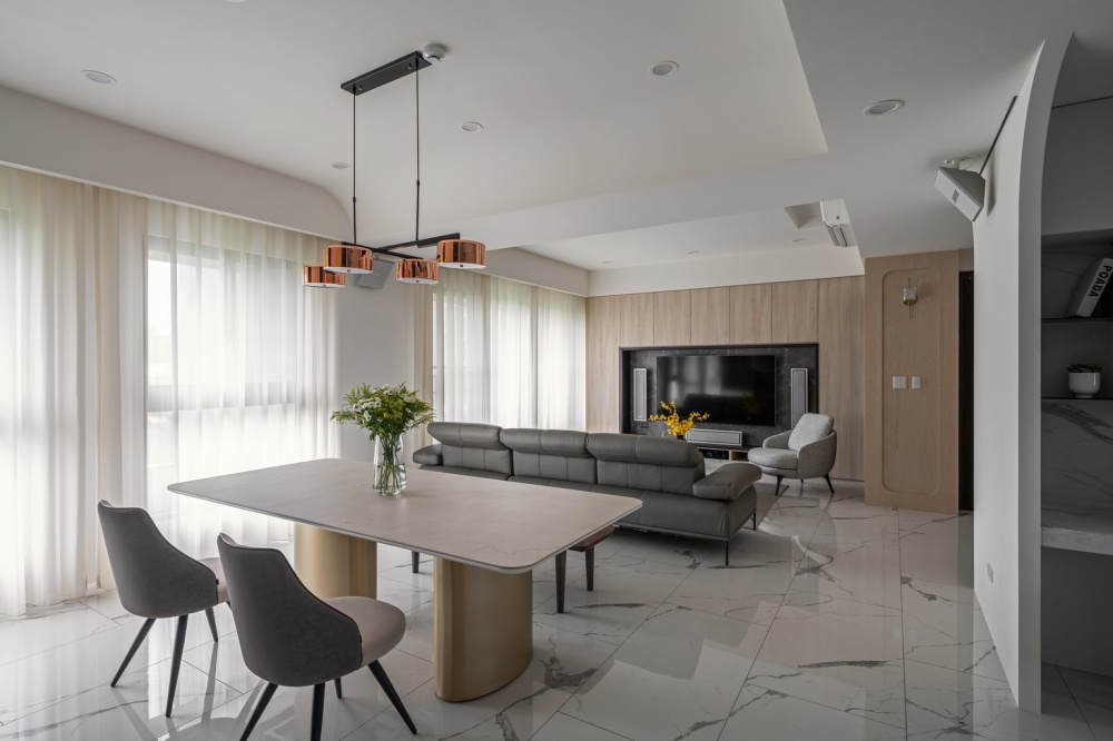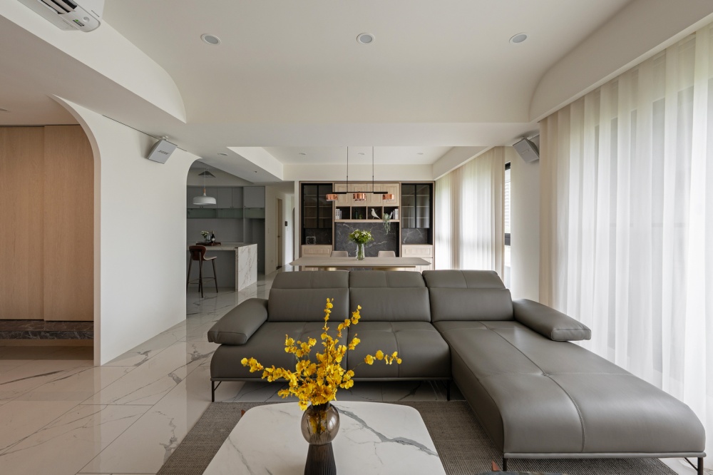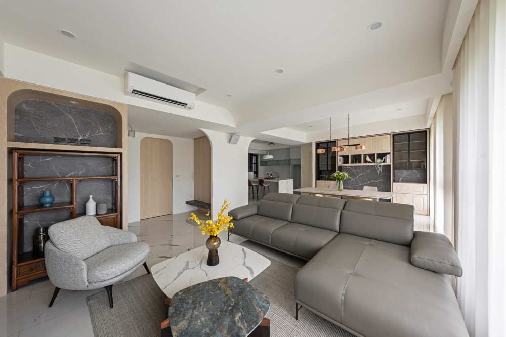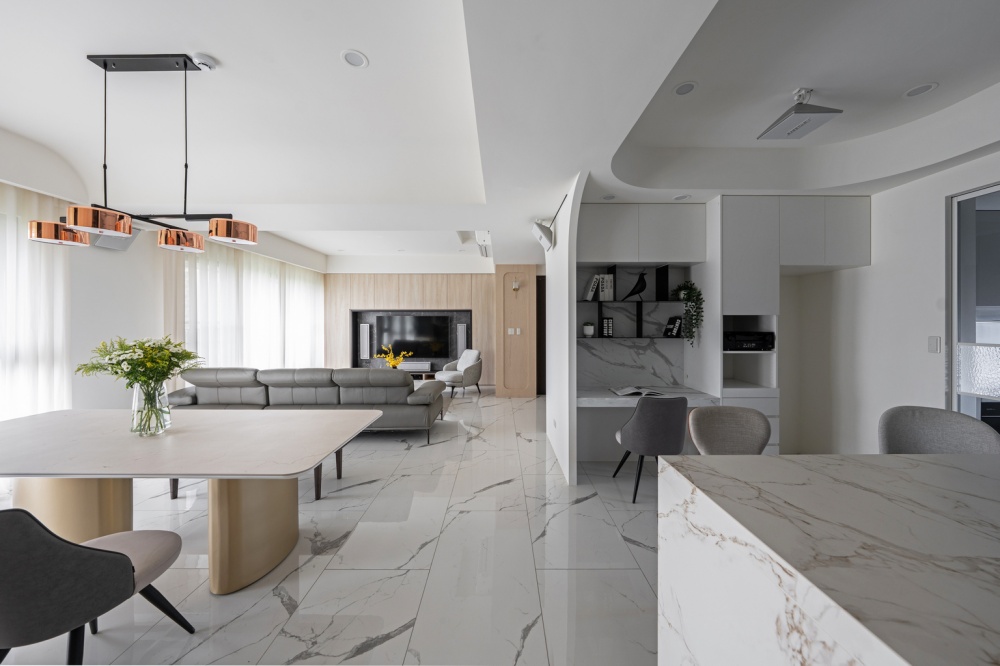 本案為一對退休夫妻的居住空間,設計主軸著重於「平衡與柔和」。設計師以圓弧線條串聯公領域的天花與牆面轉折,消弭銳角的生硬,營造安穩、溫潤的生活氛圍。整體以米白、灰、淺色木紋為基調,透過石材紋理與皮革質感的對話,形成優雅而具層次的現代雅韻。