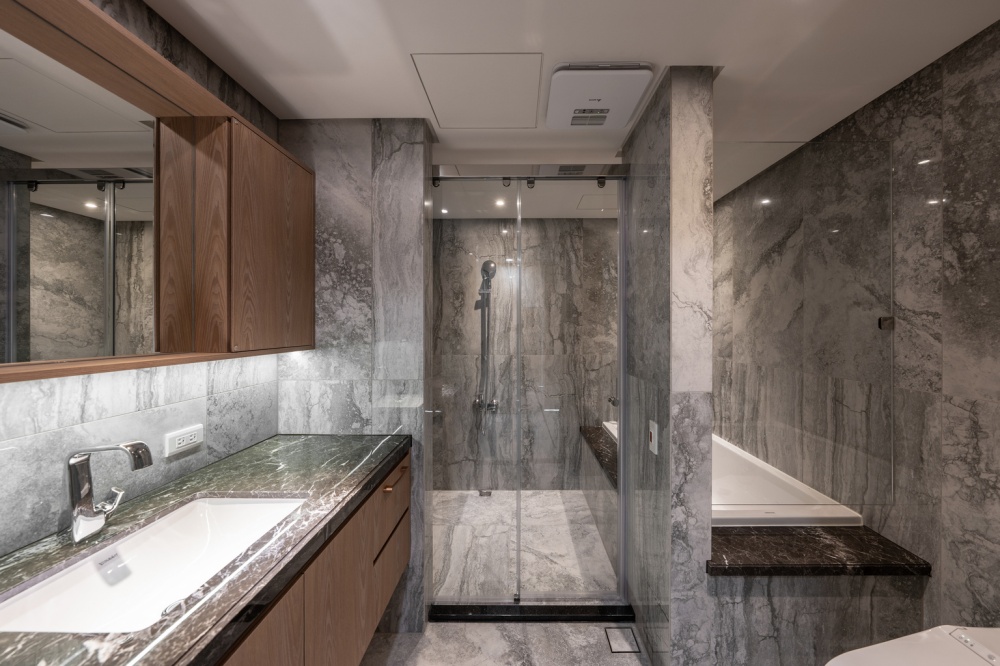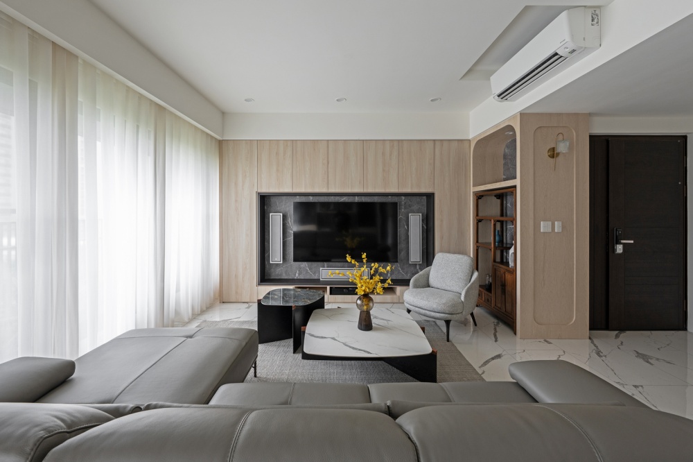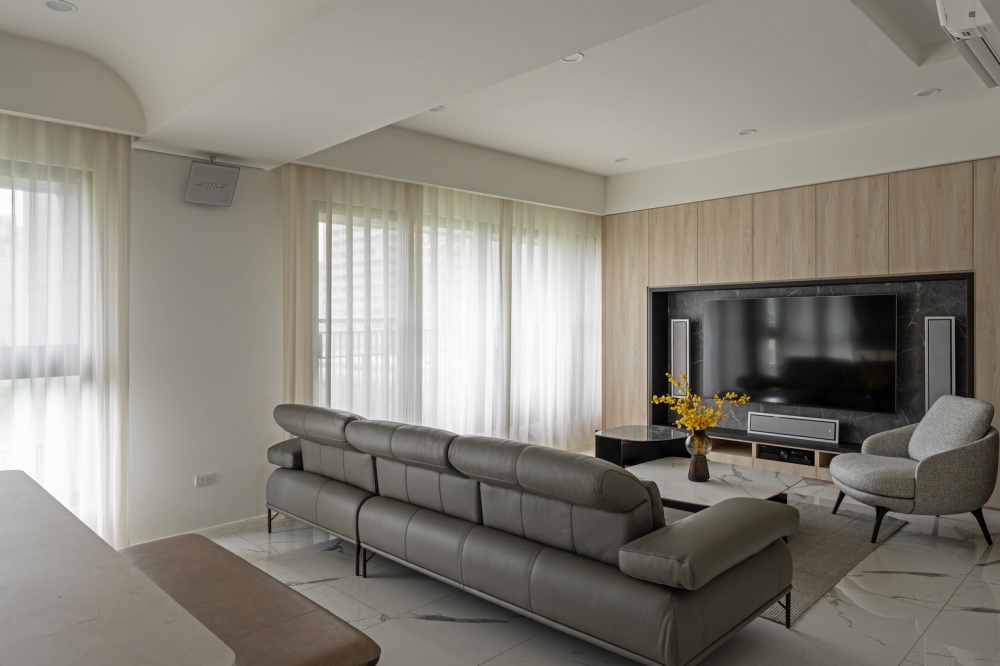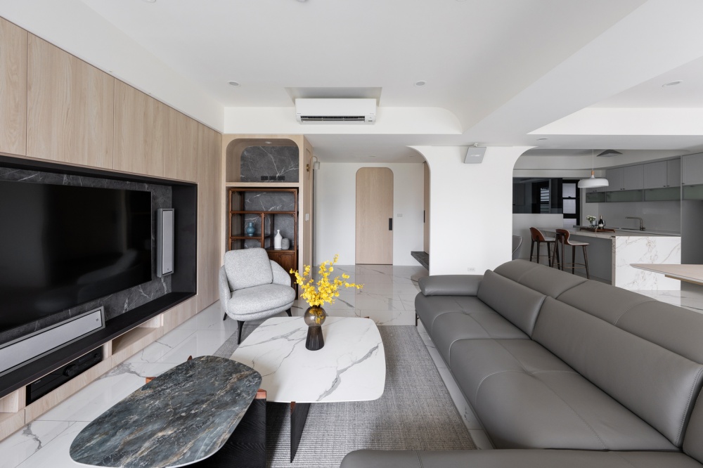 玄關以溫潤木皮門片結合深色大理石懸浮平台,形塑出沈穩迎賓的端景。由玄關延伸至客廳,弧形壁面自然引導動線,視覺上亦柔化空間界線。客廳電視牆以淺橡木皮包覆,內嵌深灰石紋板材,與地坪的白底灰紋磁磚相互呼應;搭配皮革沙發與布質單椅,建立出沉靜而具現代感的會客氛圍。