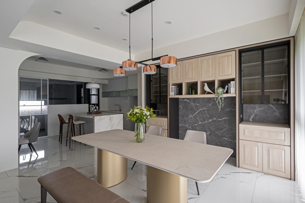 開放餐廚區與客廳相連,延續相同材質語彙。餐桌以霧面岩板搭配香檳金金屬圓柱腳座,呼應天花的弧面造型與紅銅色吊燈,展現低調的奢雅氣質。餐櫃背牆選用黑灰石紋與淺木門片組合,兼具展示與收納功能,使整體視覺更具穩定性。廚房中島以白色石英石包覆,搭配灰色櫥櫃與皮革吧椅,形塑出輕奢與實用兼具的日常中心。